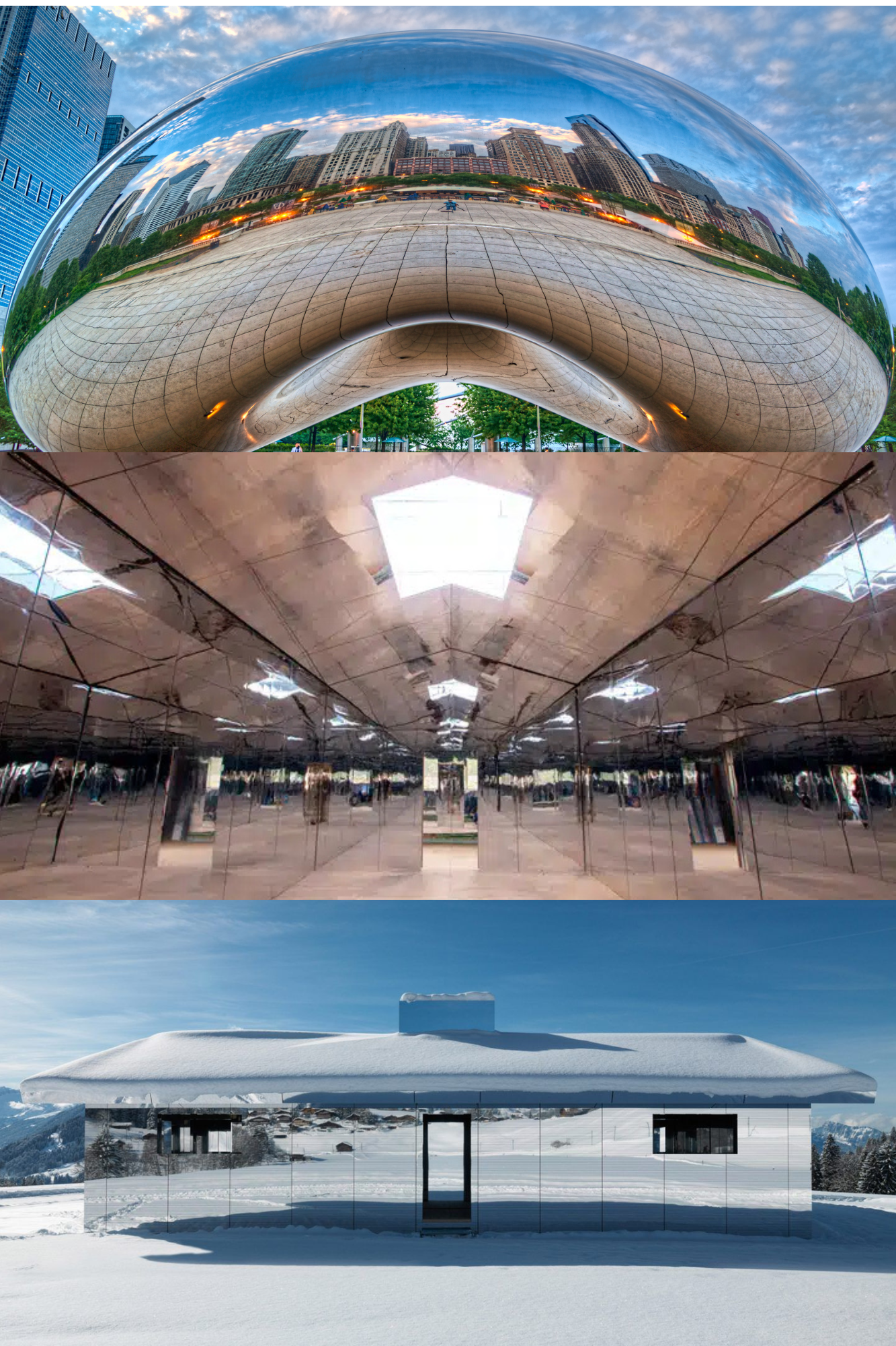 With NOW-ID, I am researching reflectivity in relation to upcoming work and will be sharing some of the things inspiring us over the next few months. I picked these three images and arranged them as you see, further sculpting the artist’s sculpting of reality through reflectivity, layering, and symmetry. Anish Kapoor’s 'Cloud Gate” (top) creates a fluid, distorted gateway, drawing inspiration from liquid mercury to invite viewers to become active participants in their environment. Doug Aitken’s 'Mirage' projects—whether the 'Mirage House' in the desert (middle) or 'Mirage Detroit' within a historic bank (bottom)—utilize the archetypal form of the suburban ranch house as a "human-scale lens". Both Kapoor and Aitken use reflection to dissolve boundaries where subject and surroundings merge in a state of constant flux, creating space that is both engaging and disorienting.